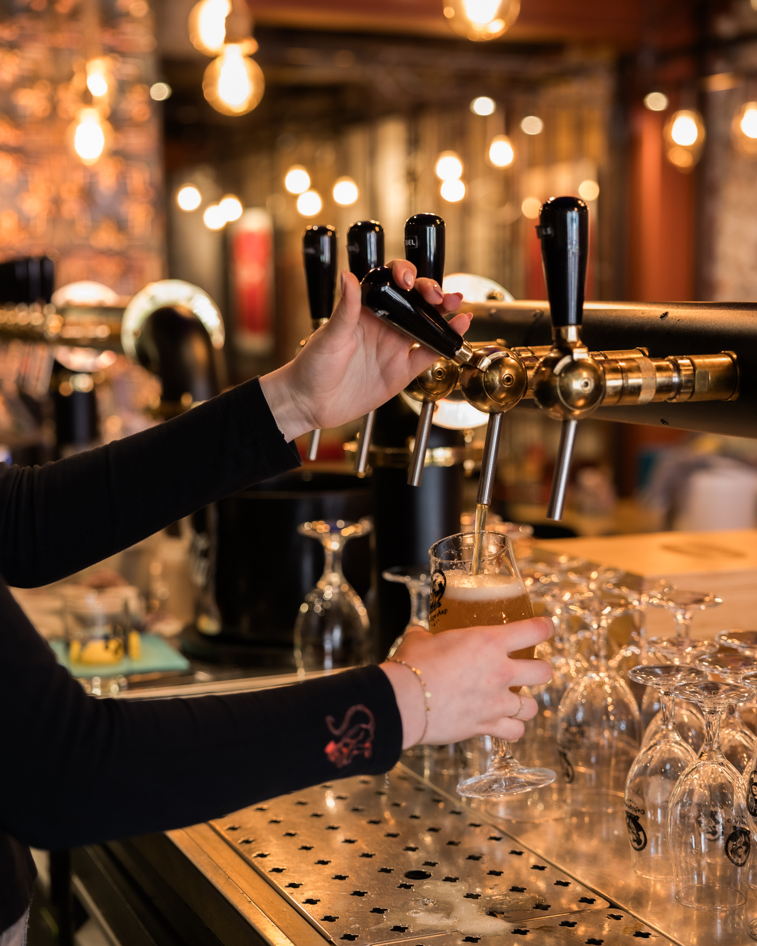 De Deftige Aap huist met haar brouwerij en haar restaurant in één van de oudste panden van de stad ( late middeleeuwen +/- 1550). Binnen zie je dat terug in de authentieke draagbalken en de middeleeuwse houten kap. De bar is gemaakt van een oude treinwagon waar ze maar liefst 10 verschillende (speciaal) bieren van de tap schenken. Je kan hier niet alleen een biertje drinken met uitzicht op de bierbrouwerij je kan hier ook fantastisch eten. De open keuken heeft een centrale plek in de zaak en zorgt voor de lekkerste bier-spijs combinaties.
